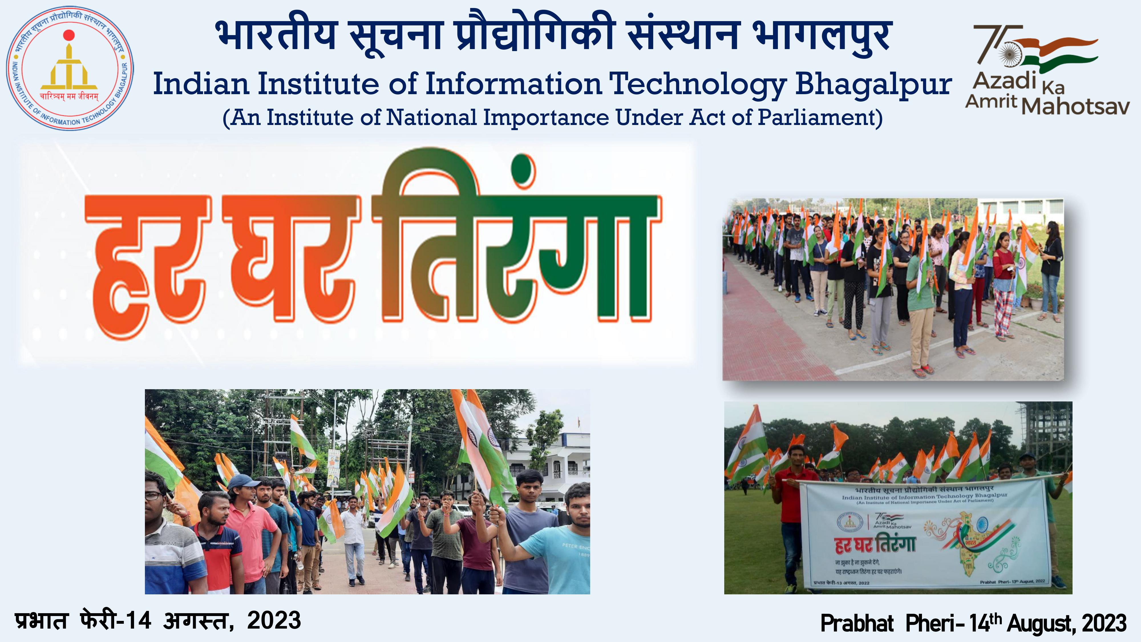 "Prabhat Pheri" is being organised by IIIT Bhagalpur on 14th August, 2023 (Monday) in the front of the administrative building in commemoration of the "Azadi Ka Amrit Mahotsav (AKAM)," which celebrates 75 years of Indian freedom. Under the aegis of AKAM, "Har Ghar Trianga" campaign launched to encourage the citizens to hoist the National Flag of India in their homes.