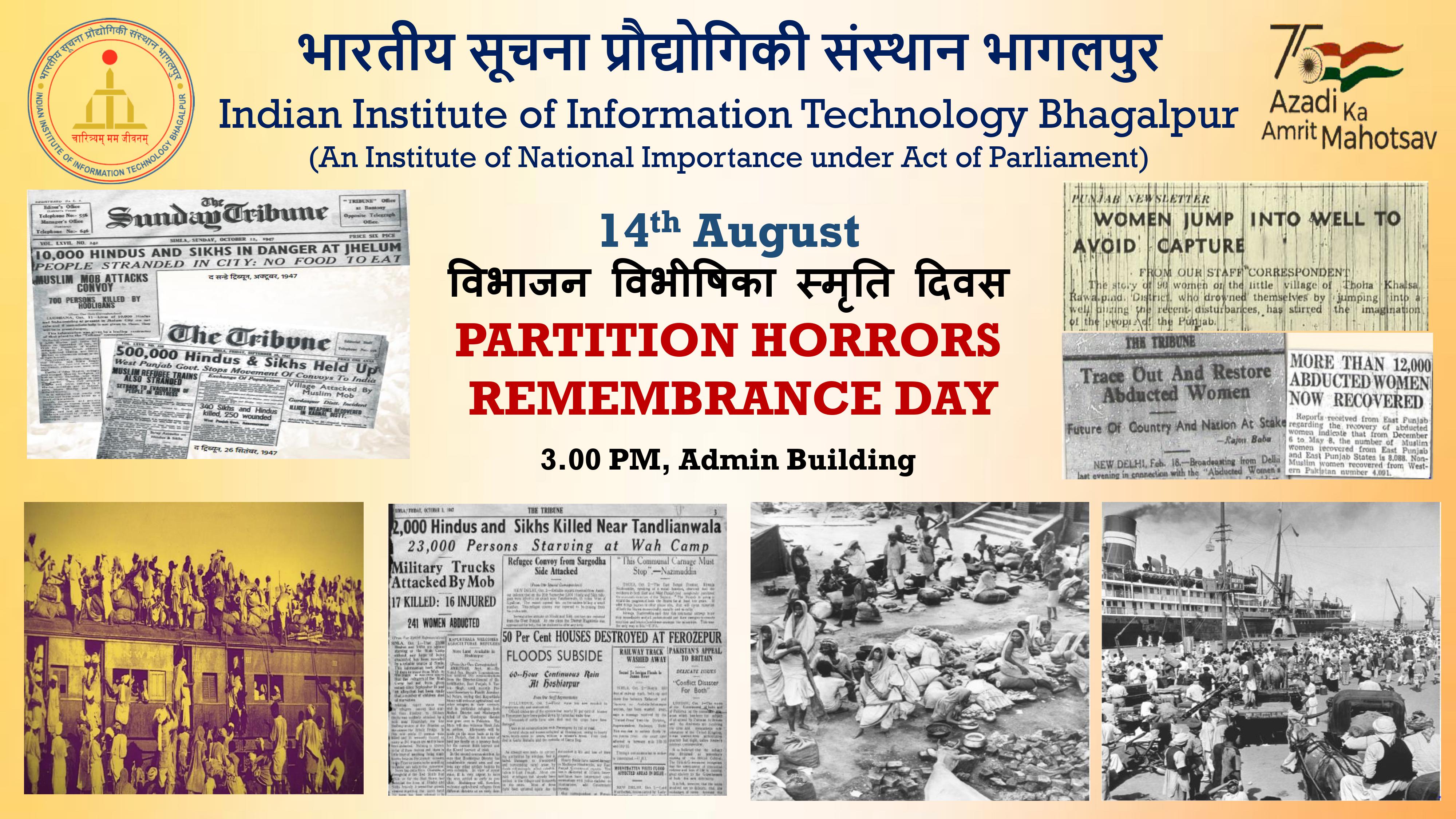 "Partition Horrors Remembrance Day" is being celebrated by IIIT Bhagalpur on 14th August, 2023 (Monday) in the virtual classroom. The "Partition Horrors Remembrance Day '' has been envisaged to bring to light the agony, sufferings and pain of millions of people who were sufferers of partition. It is to remind the country about the largest displacement of the human population in the last century, which also claimed the lives of a large number of people.