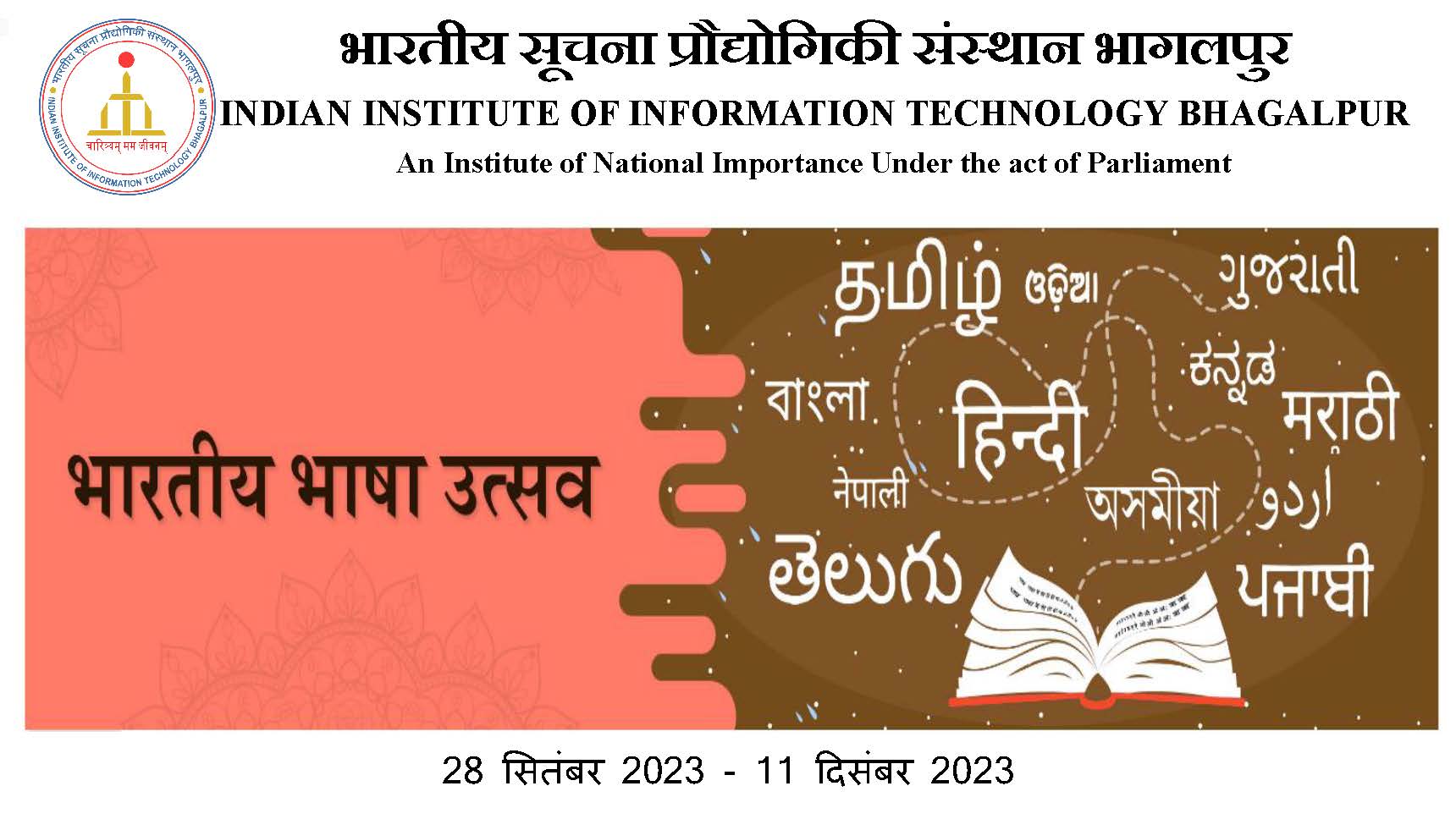 2023-12-11 10:00 AM Indian Institute of Information Technology Bhagalpur Bhartiye Bhasha Utsav Celebration of Bhartiye Bhasha Utsav at IIIT Bhagalpur from 28th September to 11 December 2023 Show on Homepage On