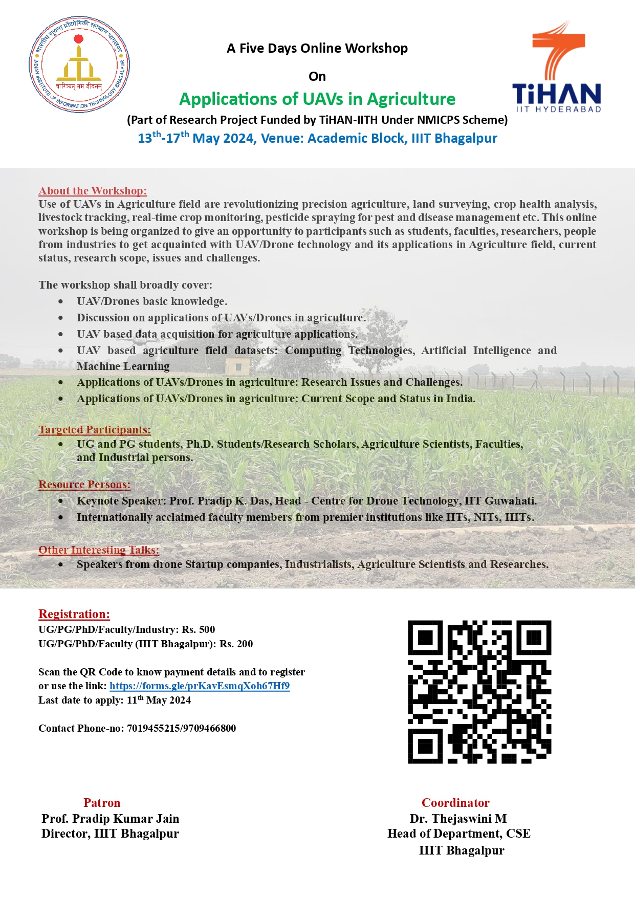 A Five Days Online Workshop On Applications of UAVs in Agriculture from 13th to 17th May 2024 Research Project Funded by TiHAN-IITH Under NMICPS Scheme in the Department of Computer Science and Engineering