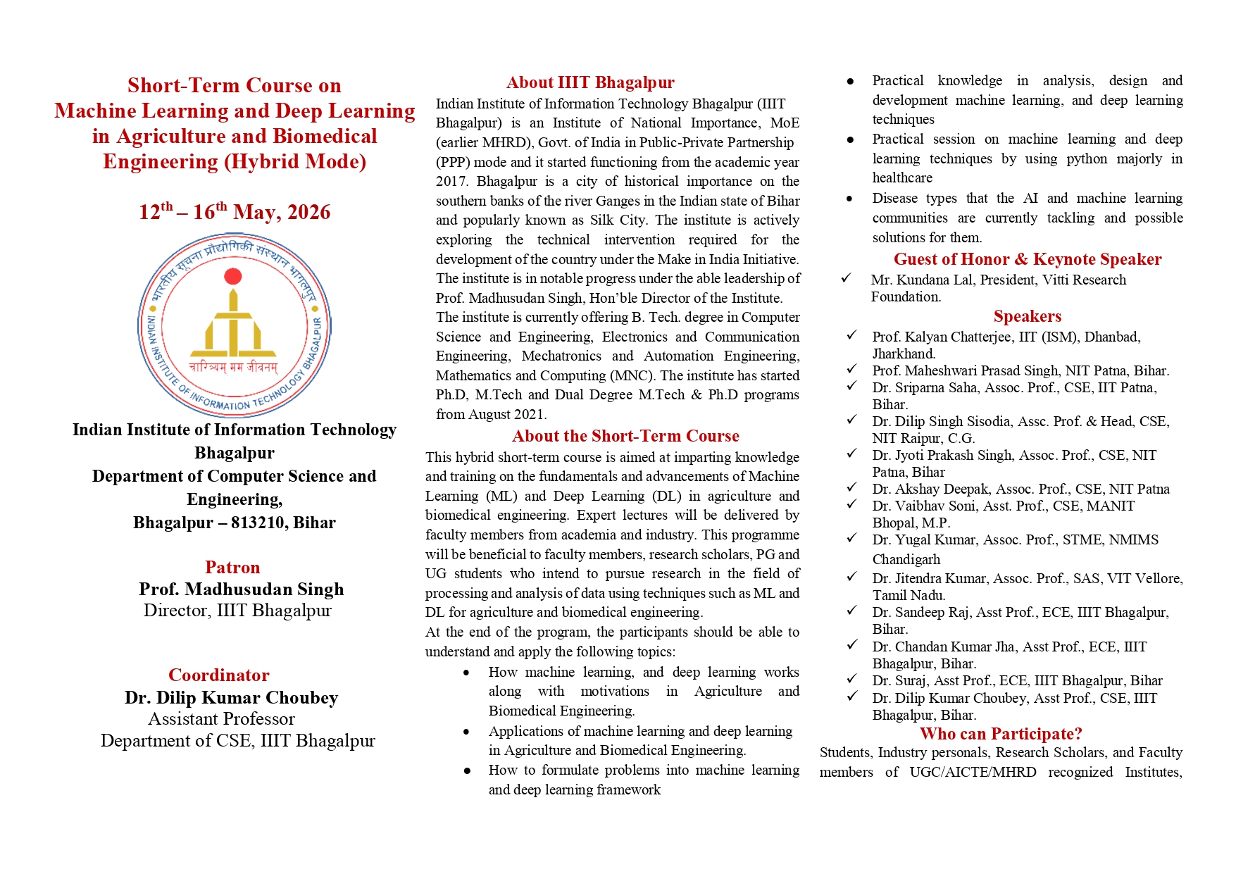 Short-Term Course on Machine Learning and Deep Learning in Agriculture and Biomedical Engineering (Hybrid Mode) 12th – 16 th May, 2026